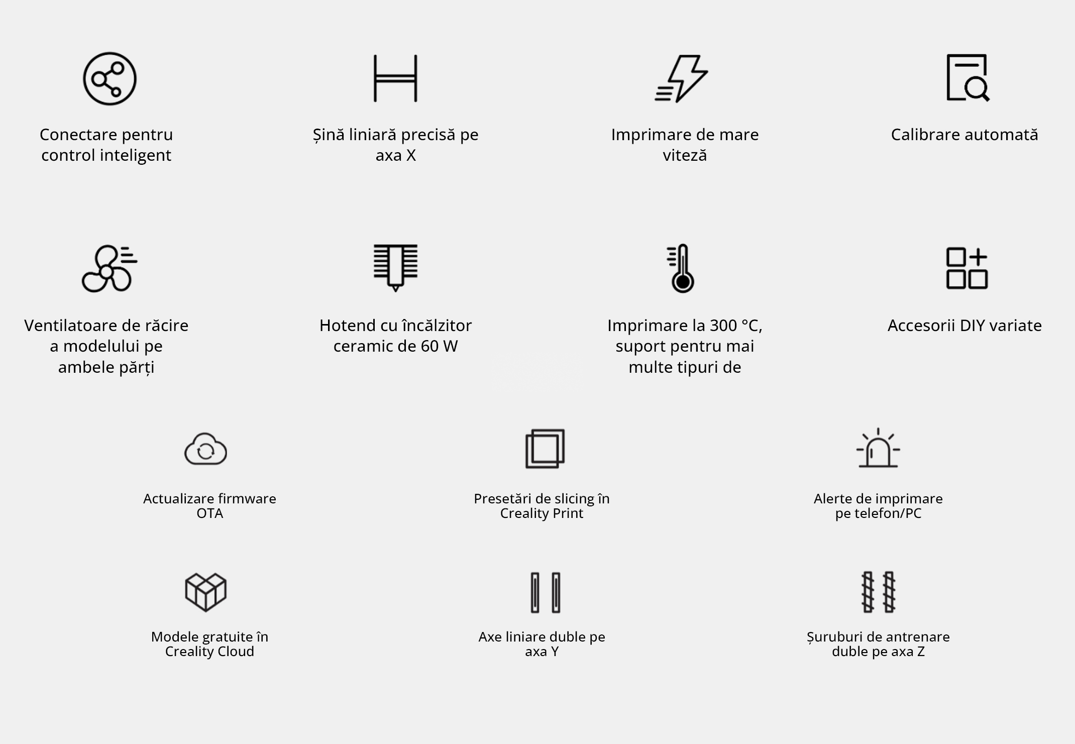 Sistem inteligent Creality OS (Klipper): Datorită procesorului puternic și firmware-ului bazat pe Klipper, imprimanta suportă funcții precum Input Shaping (eliminarea vibrațiilor) și Motion Advance, permițând imprimarea extrem de rapidă fără a sacrifica detaliile.