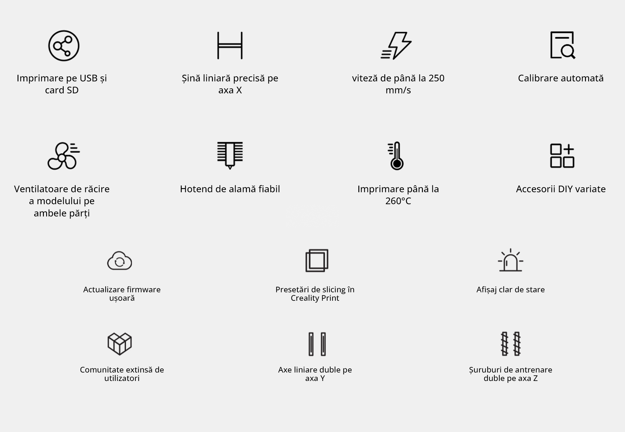 Viteză mare de imprimare: Viteza maximă este de 250 mm/s cu o accelerație de 2500 mm/s², fiind semnificativ mai rapidă decât modelele standard de bază, menținând în același timp o calitate ridicată și stabilă a detaliilor.