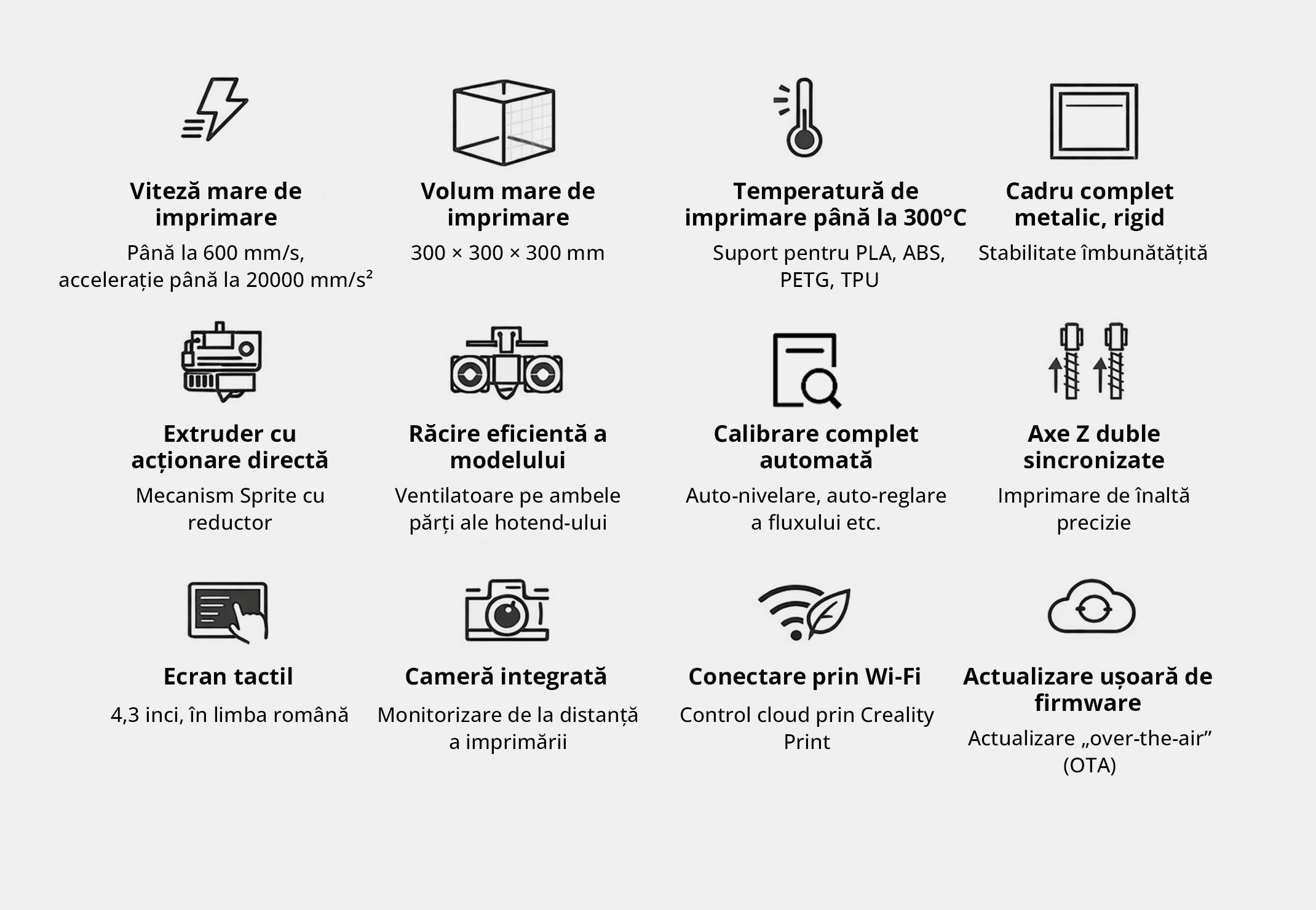 Viteză și dinamică incredibilă: Datorită arhitecturii CoreXY și greutății capului de imprimare de doar 190 g, imprimanta atinge o accelerație de 20.000 mm/s², ajungând la viteza maximă în fracțiuni de secundă.