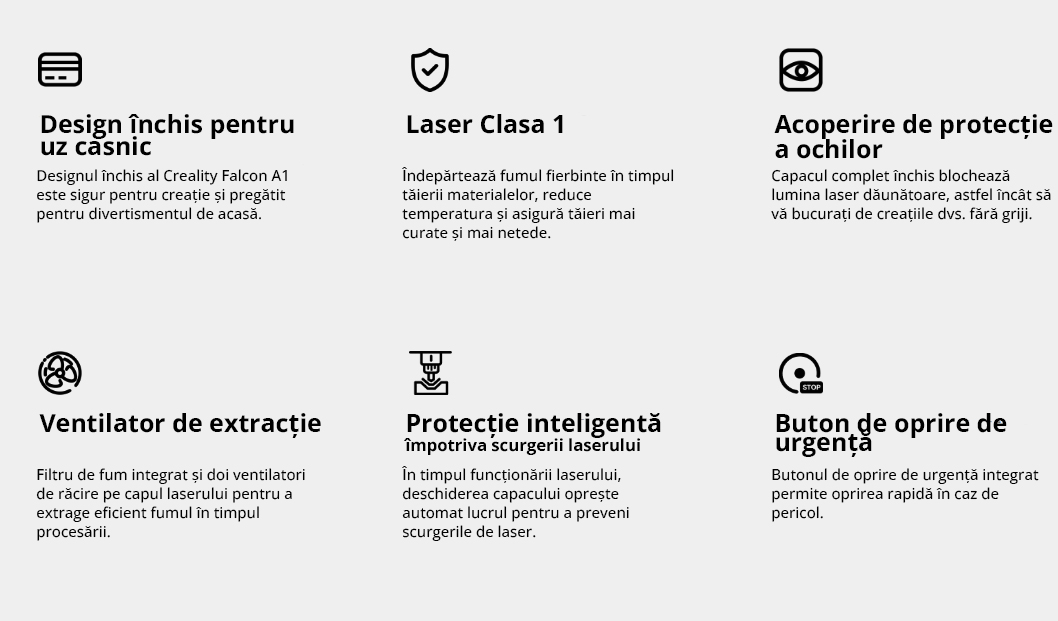 Creality Falcon A1 este ideal pentru proiecte de hobby, studiouri creative și instituții educaționale unde siguranța, precizia și comoditatea lucrului cu materiale variate sunt esențiale.