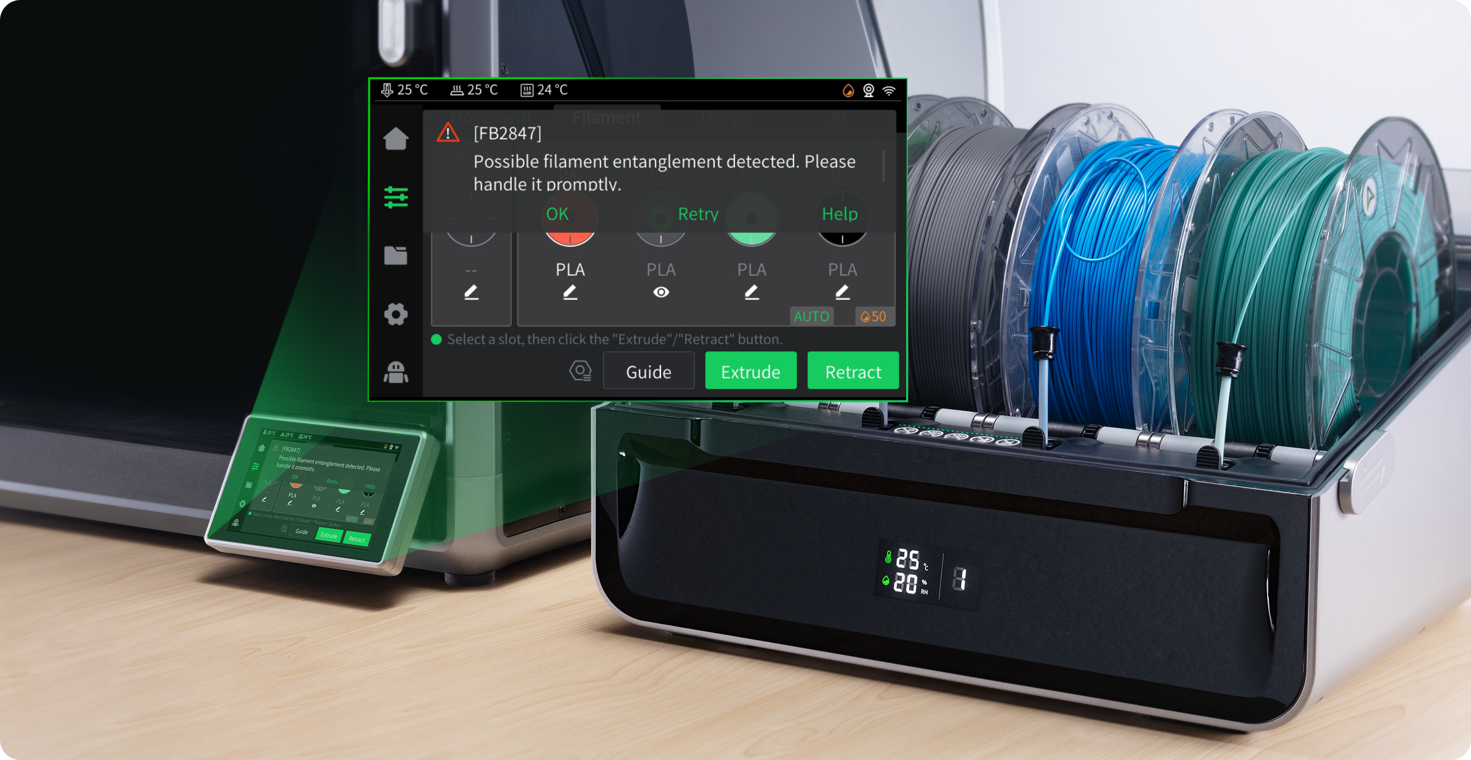 Mecanism de alimentare de înaltă precizie: Fiecare dintre cele patru sloturi este echipat cu propria unitate de antrenare independentă și un senzor de filament. Dacă filamentul se blochează sau se încurcă pe rolă, sistemul notifică imediat utilizatorul, prevenind astfel eșecul imprimării.