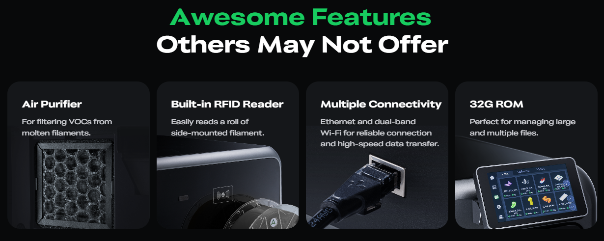 Высокоскоростная печать: Благодаря облегченной печатающей головке и усиленным моторам, принтер развивает скорость до 600 мм/с, что в несколько раз быстрее стандартных 3D-принтеров.