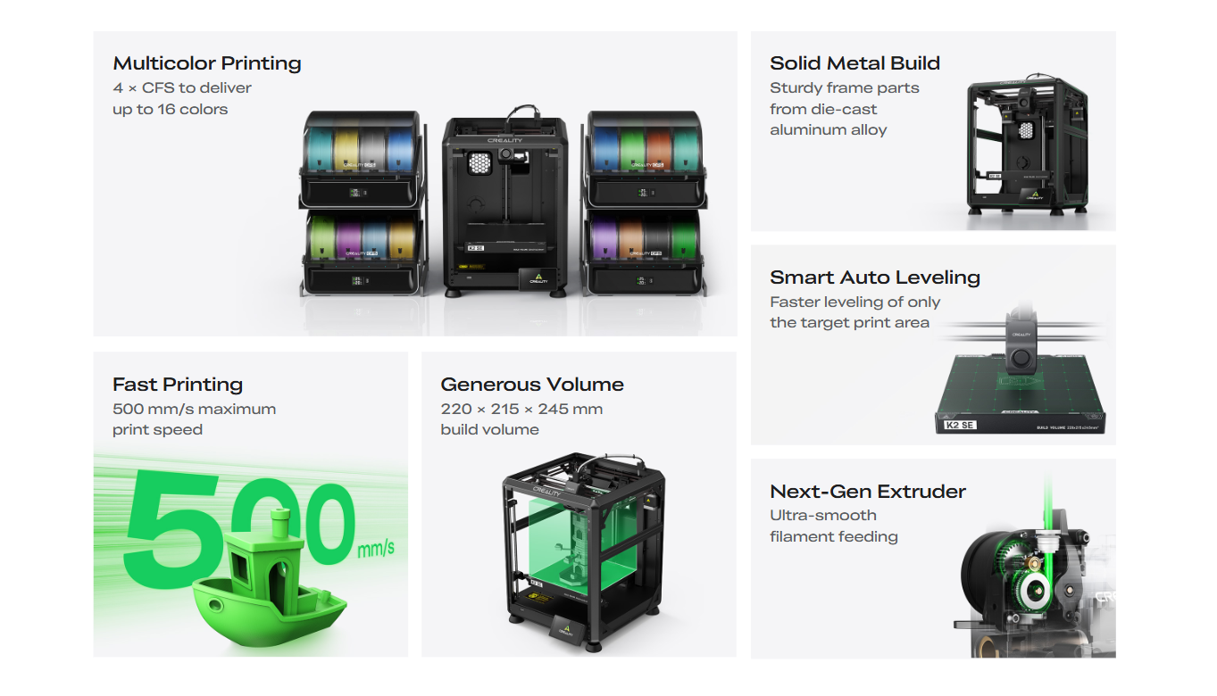 Creality K2 SE — это высокопроизводительный 3D-принтер нового поколения, построенный на базе передовой архитектуры K2. Модель сочетает огромную область печати с впечатляющей скоростью, предлагая пользователям надежность флагманской серии в удобном открытом корпусе.